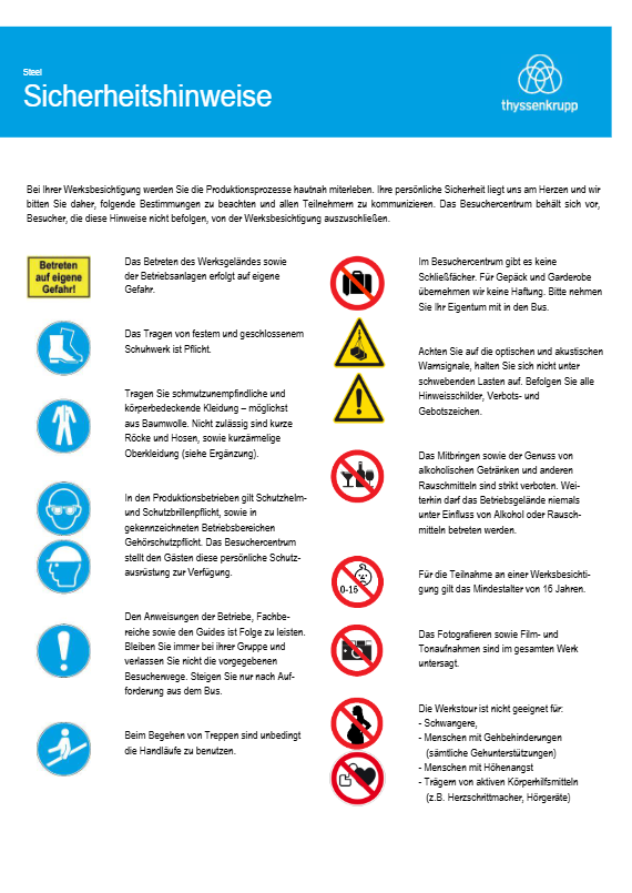 Erleben Sie Industriegeschichte hautnah bei einer spannenden Tagesfahrt nach Duisburg! Freuen Sie sich auf eine 2,5-stündige Führung durch das Thyssenkrupp Werk und erhalten Sie faszinierende Einblicke in die moderne Stahlproduktion. Anschließende Fahrt zum Duisburger Innenhafen und Zeit zur freien Verfügung.